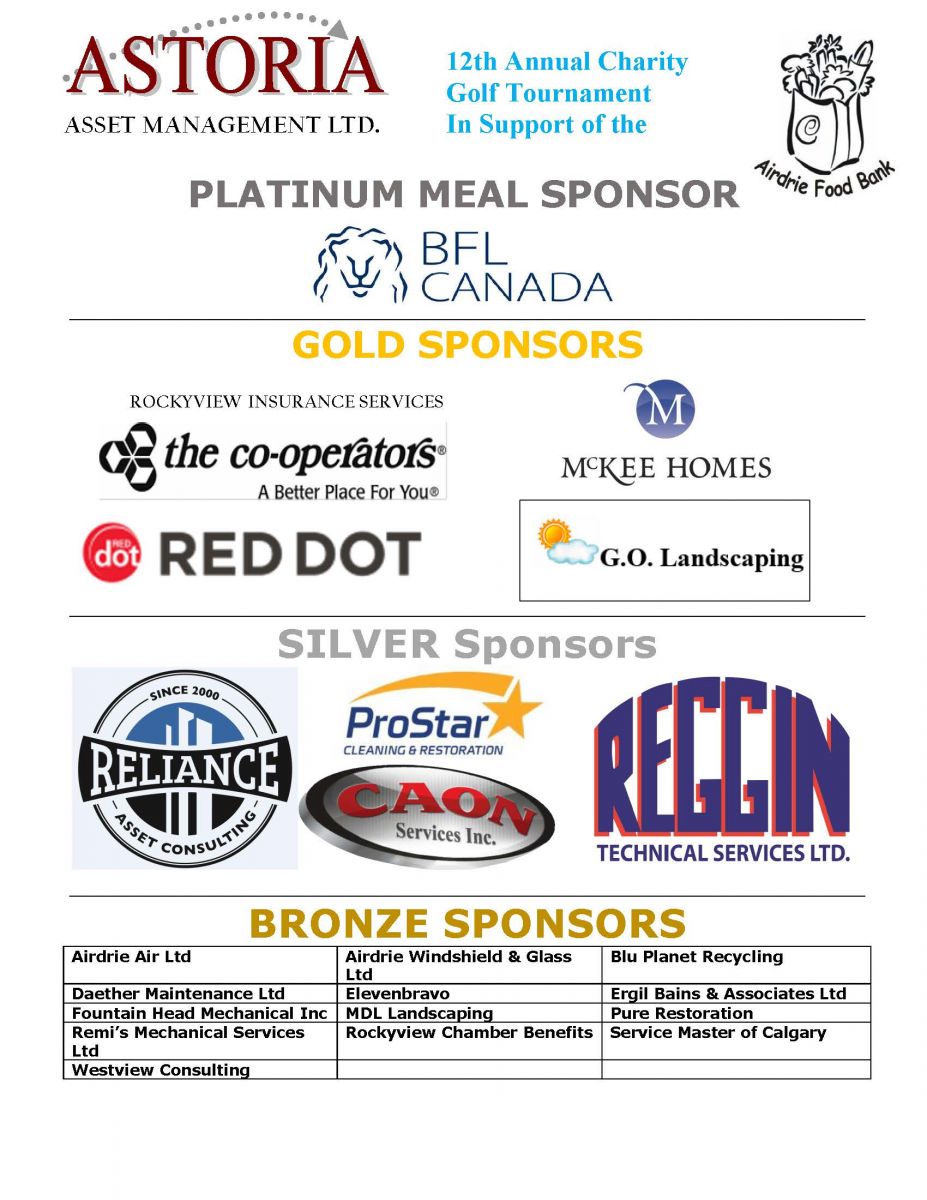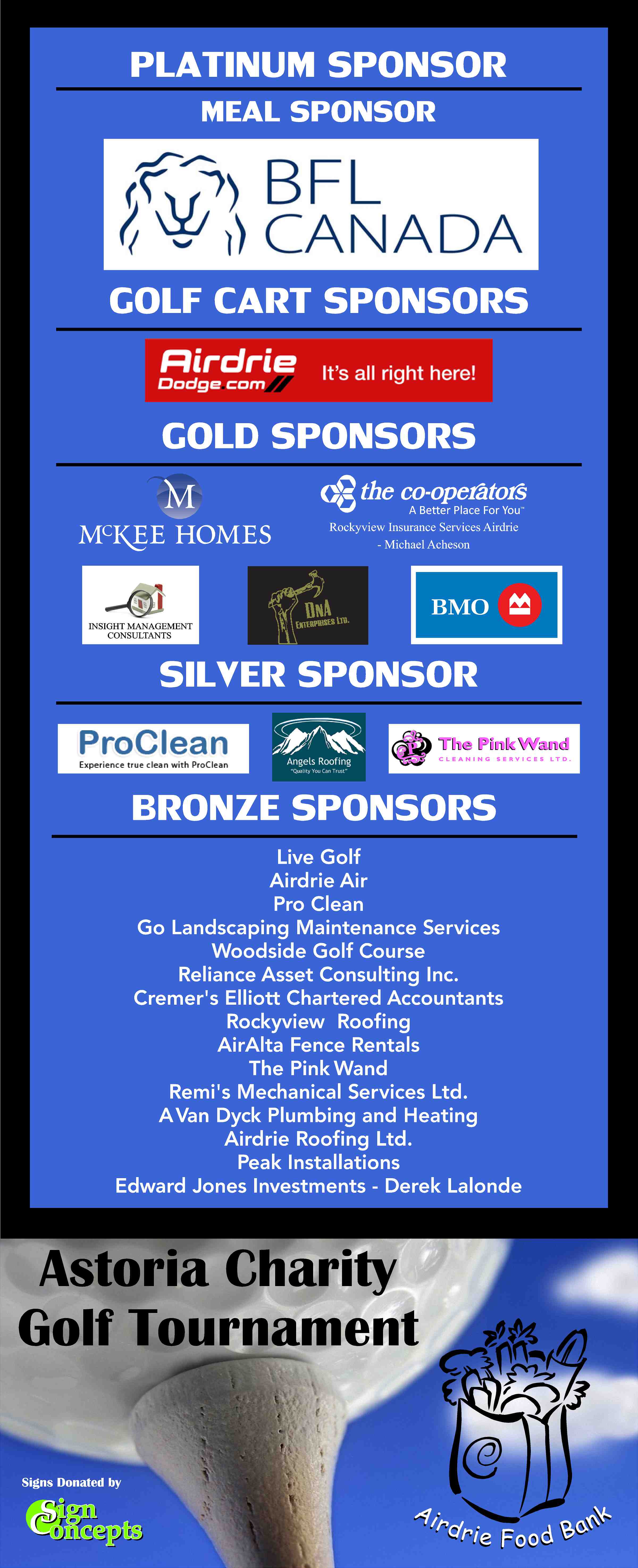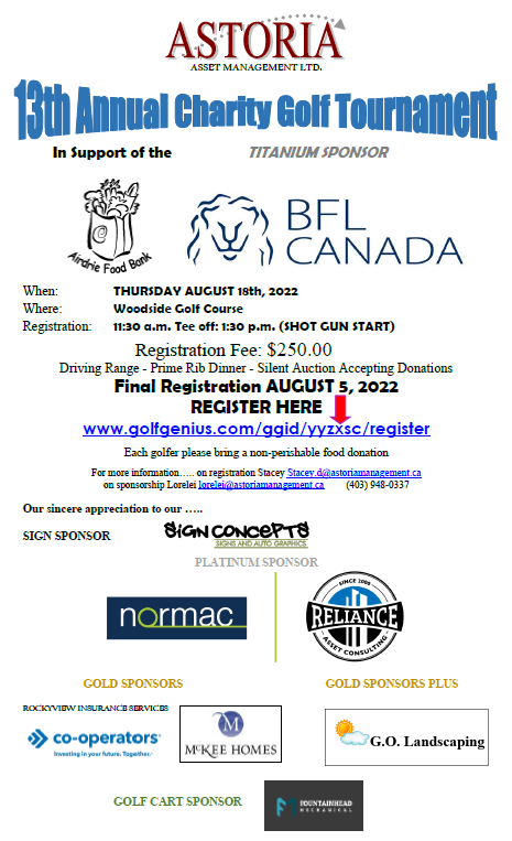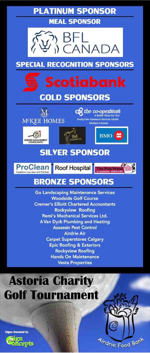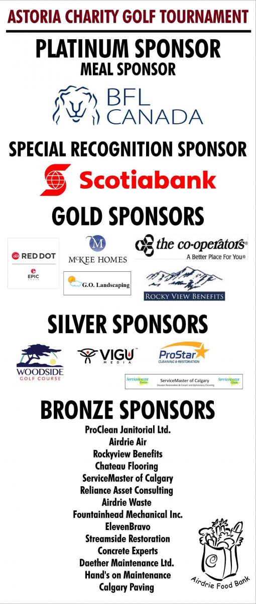 The Staff and Board of the Airdrie Food Bank would like to say a huge thank you to everyone who supported the Astoria Charity Golf Tournament this year. What a fabulous event with the totals earned to support our programs more than ever before. Your generosity will go a long way in helping individuals, families and children in need in our community and we couldn't provide our services without your support. Thank you so much for caring enough to give where you do business. Your generosity makes Airdrie a better place!